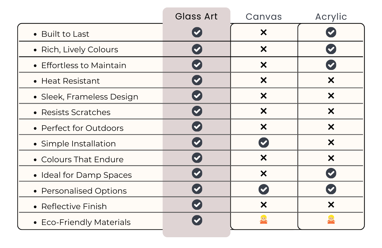 Glass wall art is much safer than you might think. Let me explain: Our specially designed carbon steel interlocking bracket system for wall mounting ensures that even if you accidentally bump into it, it'll just sway and settle.